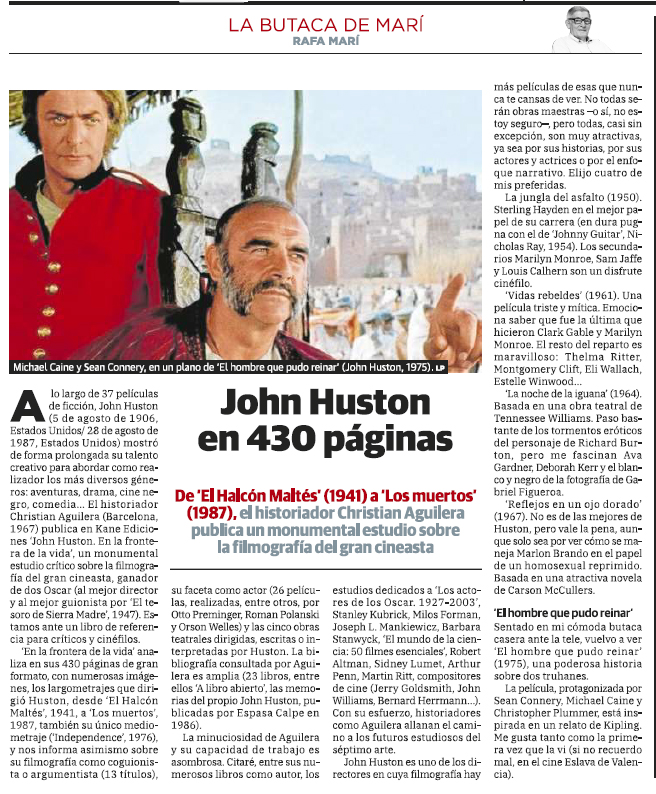 «Aguilera, que ha escrito monografías sobre cineastas como Kubrick, Weir o Frankenheimer, por citar unos pocos, recorre la carrera de Huston, su formación y madurez creativa, los tropos y temas -particularmente interesante su mitología en torno a los perdedores-, los rostros y los lugares, los éxitos y también los trabajos menores. El resultado es un ensayo potente, bien documentado y meticuloso que, ante todo, devuelve a John Huston al lugar que merece dentro del panorama cinéfilo.»